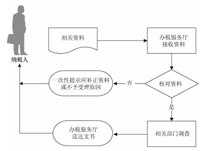(1)办税服务厅接收资料,核对资料是否符合法定形式、填写内容是否完整,符合的即时受理;不符合的当场一次性提示应补正资料或不予受理原因。