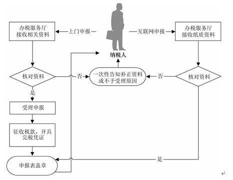(1)办税服务厅接收纳税人资料或纳税人通过互联网络申报后提交的纸质资料,核对纳税人报送资料是否齐全、是否符合法定形式、是否完整填写减(免)税额等内容,符合的即时办结;不符合的当场一次性告知纳税人应补正资料或不予受理原因。