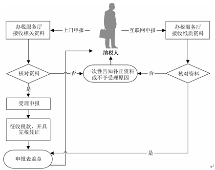 (1)办税服务厅接收纳税人资料或纳税人通过互联网络申报后提交的纸质资料,核对纳税人报送资料是否齐全、是否符合法定形式、填写内容是否完整,符合的即时办结;不符合的当场一次性告知纳税人应补正资料或不予受理原因。