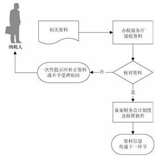 (1)办税服务厅接收资料,核对纳税人报送资料是否齐全、是否符合法定形式,符合的即时办结;不符合的当场一次性提示纳税人应补正资料或不予受理原因。