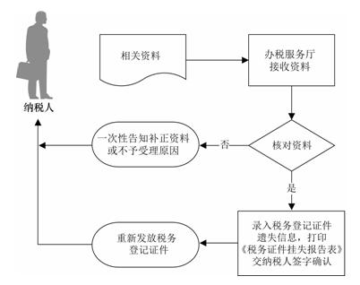 遗失税务登记证件的纳税人、扣缴义务人,书面报告主管税务机关,如实填写《税务证件挂失报告表》,并将纳税人名称、税务登记证件名称、税务登记证件号码、税务登记证件发证日期、发证机关名称在市级以上公开发行的报刊上作遗失声明,凭报刊上刊登的遗失声明向税务机关申请补办税务登记证件。