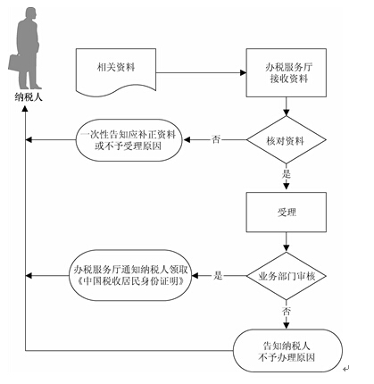 (3)办税服务厅收到反馈后1个工作内通知纳税人领取《中国税收居民身份证明》或告知不予办理原因。