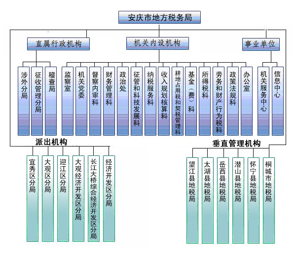 安庆市地税局基本情况 安庆市地税局辖怀宁、潜山、岳西、太湖、望江5个县局和桐城市局(宿松县局因“省管县”体制改革划归宿松县委县政府管理),下设3个直属机构和6个派出机构。市局机关内设14个科室和2个事业机构。 近年来,安庆市地税局在省局和安庆市委市政府的正确领导下,安庆地税人艰苦创业,奋力拼搏,积极进取,取得了显著的成绩。2011年,全系统共组织入库地方税费收入68.58亿元,同比增收15.7亿元,增长29.8%,为安庆市的经济发展和社会稳定作出了积极贡献。市局和所有县(市)局全部荣获安徽省第九届文明单位称号;市局被授予第三批“全国文明单位”,连续六年被市委、市政府评为争先创优目标绩效考核优秀单位,并荣获安庆市第三届文明行业称号。迎江区分局办税服务厅被评为“全国巾帼文明岗”,系统有4个单位荣获安庆市创建文明行业先进单位、有5 个单位荣获安庆市文明窗口称号。 市局机关内设机构(14个): 办公室、政策法规科、劳务和财产行为税科、所得税科、耕地占用税和契税管理科、基金(费)科、收入规划核算科、纳税服务科、征管和科技发展科、政治处、财务管理科、督察内审科、机关党委、监察室等14个。 直属行政机构(3个): 1、be365稽查局(副处级建制)。2、be365征收管理分局(副处级建制)。3、be365涉外分局。 事业单位(2个): 信息中心、机关服务中心。 派出机构(6个): 1、be365经济开发区分局(副处级建制)。2、be365长江大桥综合经济开发区分局。3、be365大观经济开发区分局。4、be365迎江区分局。5、be365大观区分局。6、be365宜秀区分局。 垂直管理机构(6个): 桐城市地税局、怀宁县地税局、潜山县地税局、岳西县地税局、太湖县地税局、望江县地税局。 |